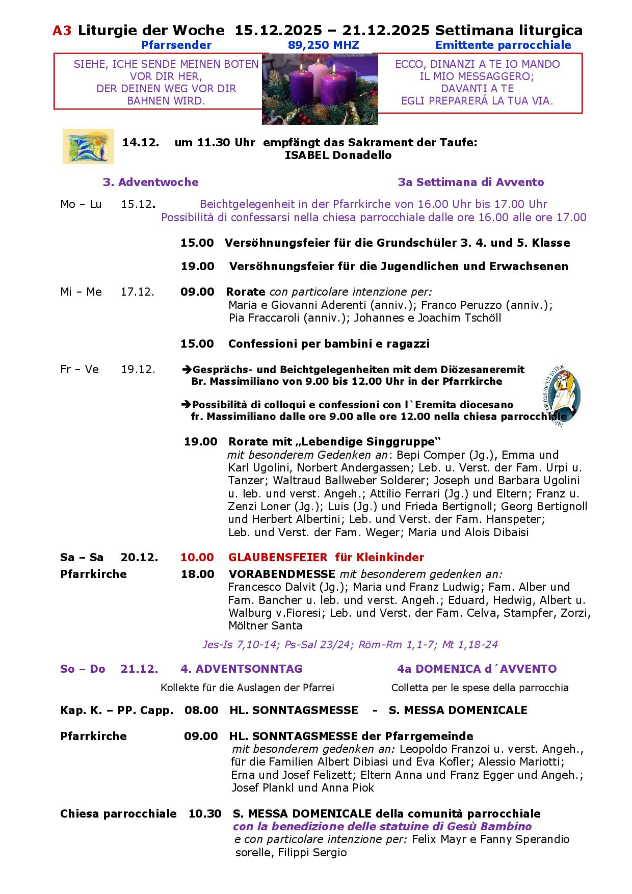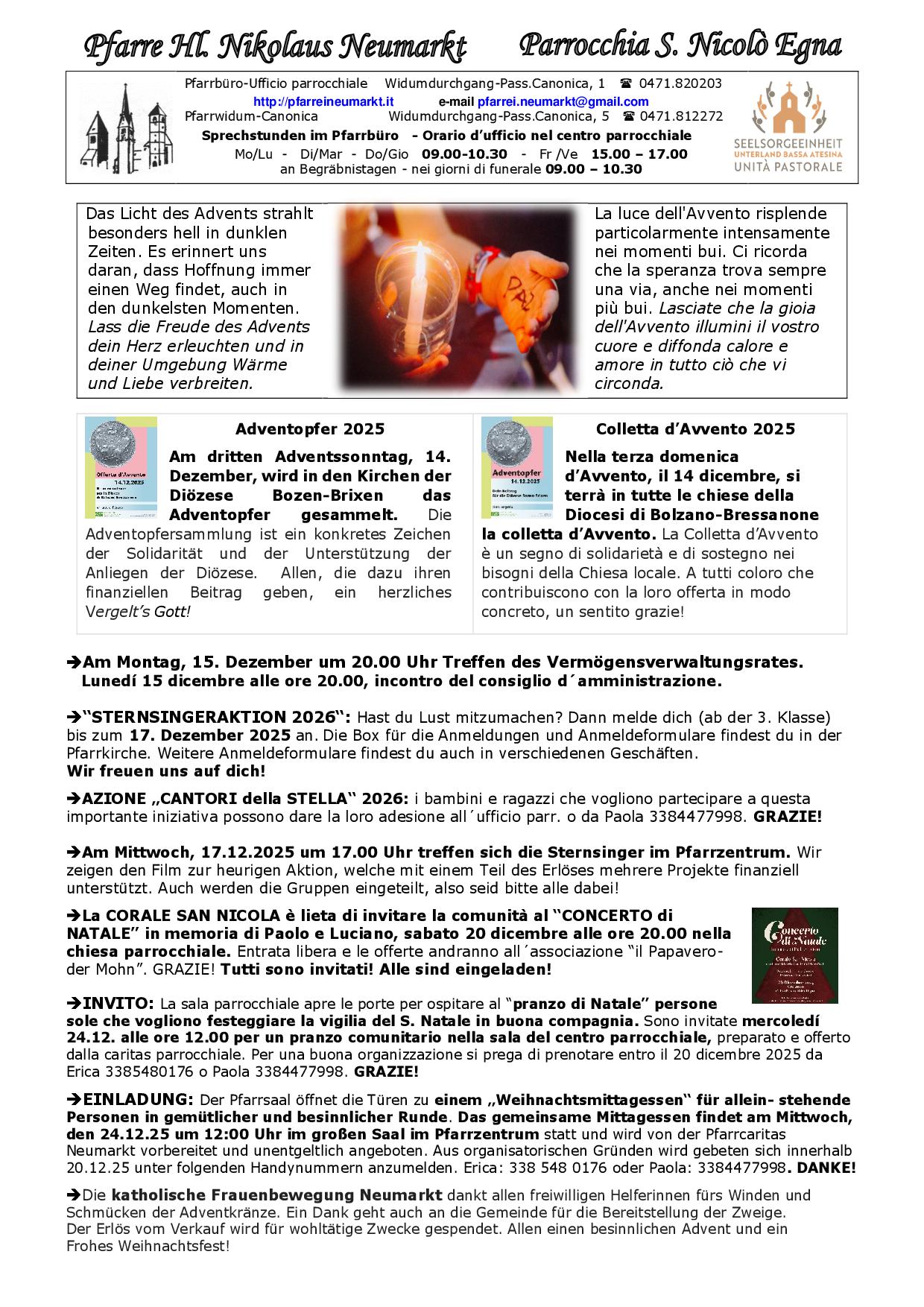 EINLADUNG: Der Pfarrsaal öffnet die Türen zu einem "Weihnachtsmittagessen" für allein- stehende Personen in gemütlicher und besinnlicher Runde. Das gemeinsame Mittagessen findet am Mittwoch, den 24.12.25 um 12:00 Uhr im großen Saal im Pfarrzentrum statt und wird von der Pfarrcaritas Neumarkt vorbereitet und unentgeltlich angeboten. Aus organisatorischen Gründen wird gebeten sich innerhalb 20.12.25 unter folgenden Handynummern anzumelden. Erica: 338 548 0176 oder Paola: 3384477998. DANKE!