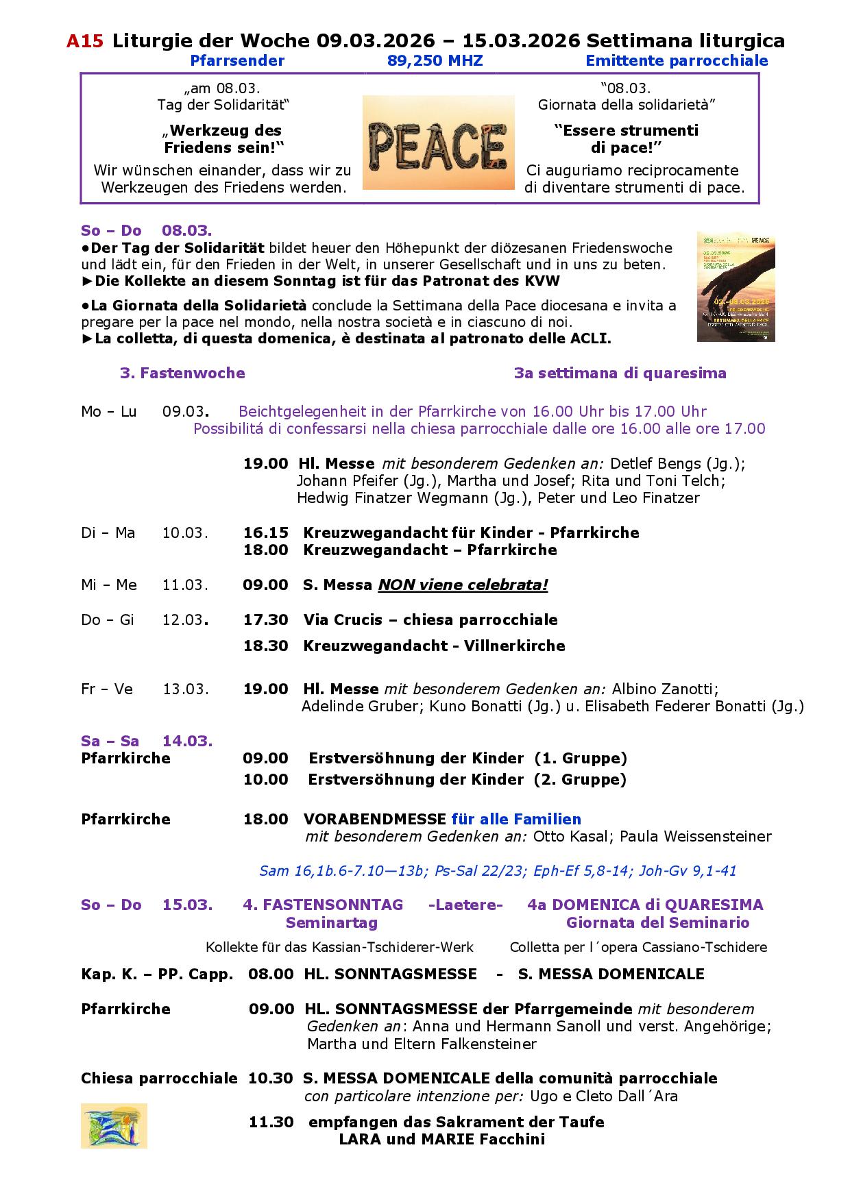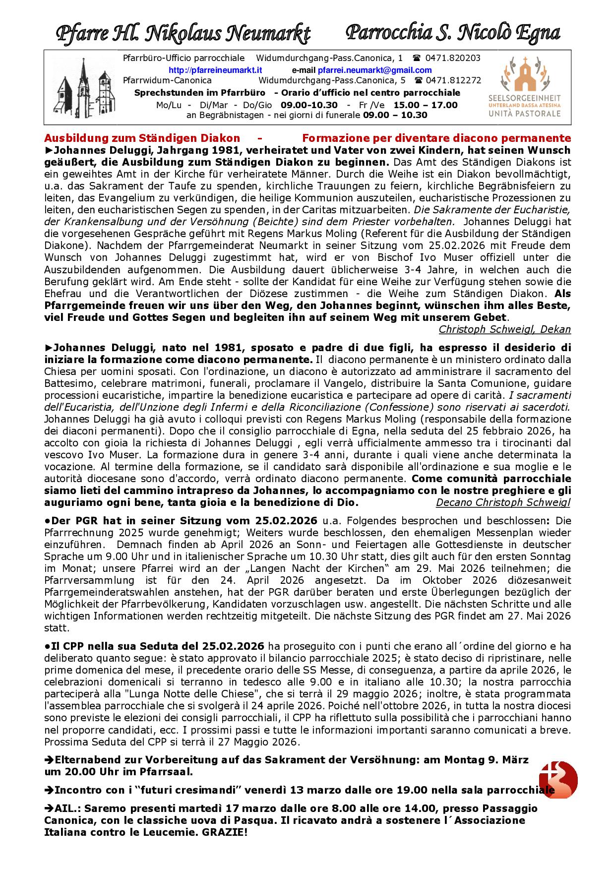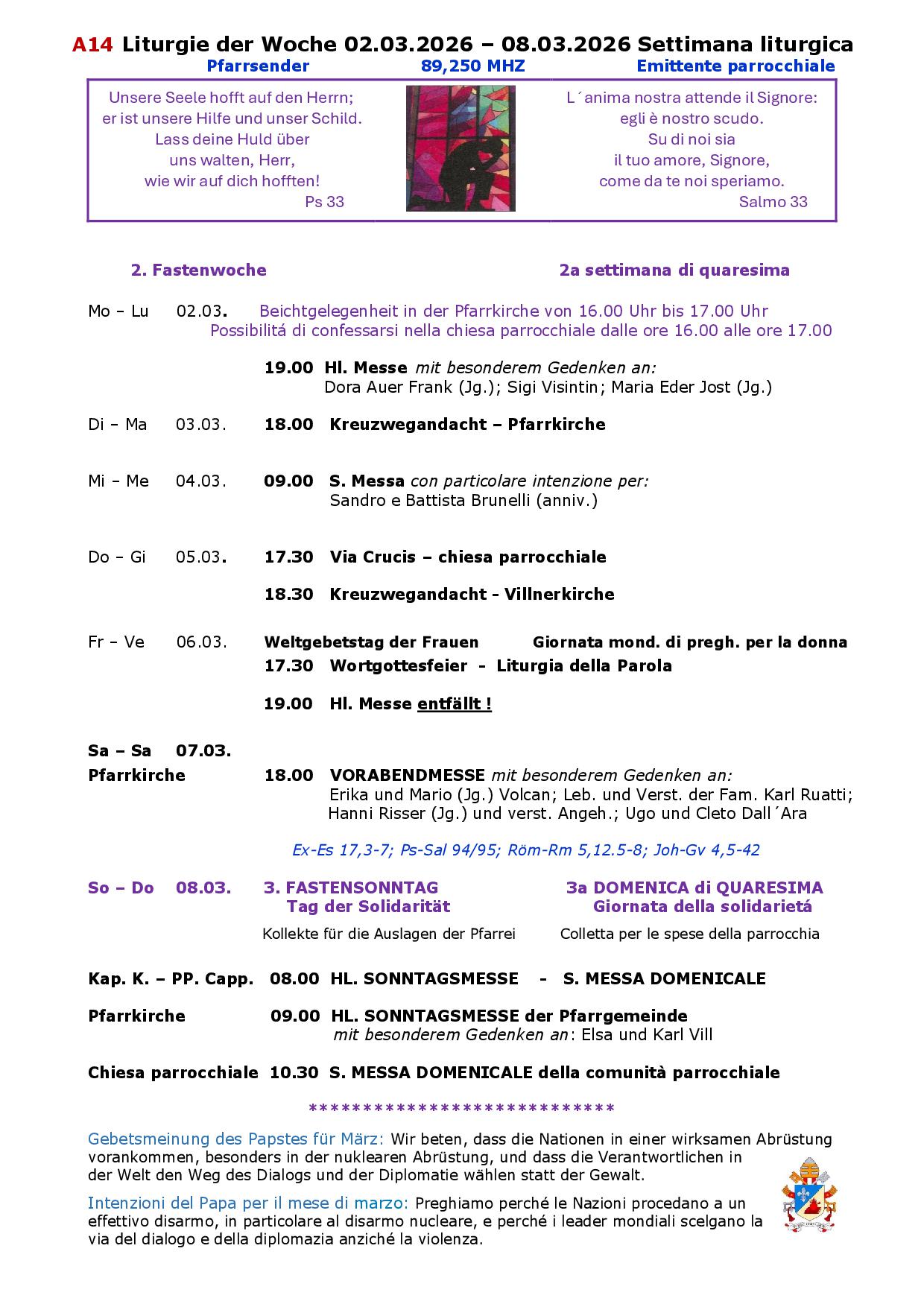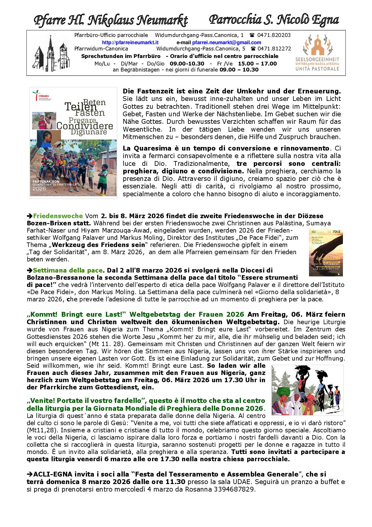 "Venite! Portate il vostro fardello", questo è il motto che sta al centro della liturgia per la Giornata Mondiale di Preghiera delle Donne 2026. La liturgia di quest´anno é stata preparata dalle donne della Nigeria. Al centro del culto ci sono le parole di Gesù: "Venite a me, voi tutti che siete affaticati e oppressi, e io vi darò ristoro" (Mt11,28). Insieme a cristiani e cristiane di tutto il mondo, celebriamo questo giorno speciale. Ascoltiamo le voci della Nigeria, ci lasciamo ispirare dalla loro forza e portiamo i nostri fardelli davanti a Dio. Con la colletta che si raccoglierà in questa liturgia, saranno sostenuti progetti per le donne e ragazze in tutto il mondo. È un invito alla solidarietà, alla preghiera e alla speranza. Tutti sono invitati a partecipare a questa liturgia venerdì 6 marzo alle ore 17.30 nella nostra chiesa parrocchiale.