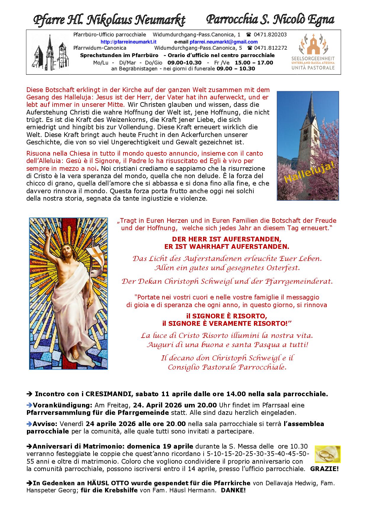 Vorankündigung: Am Freitag, 24. April 2026 um 20.00 Uhr findet im Pfarrsaal eine Pfarrversammlung für die Pfarrgemeinde statt. Alle sind dazu herzlich eingeladen.