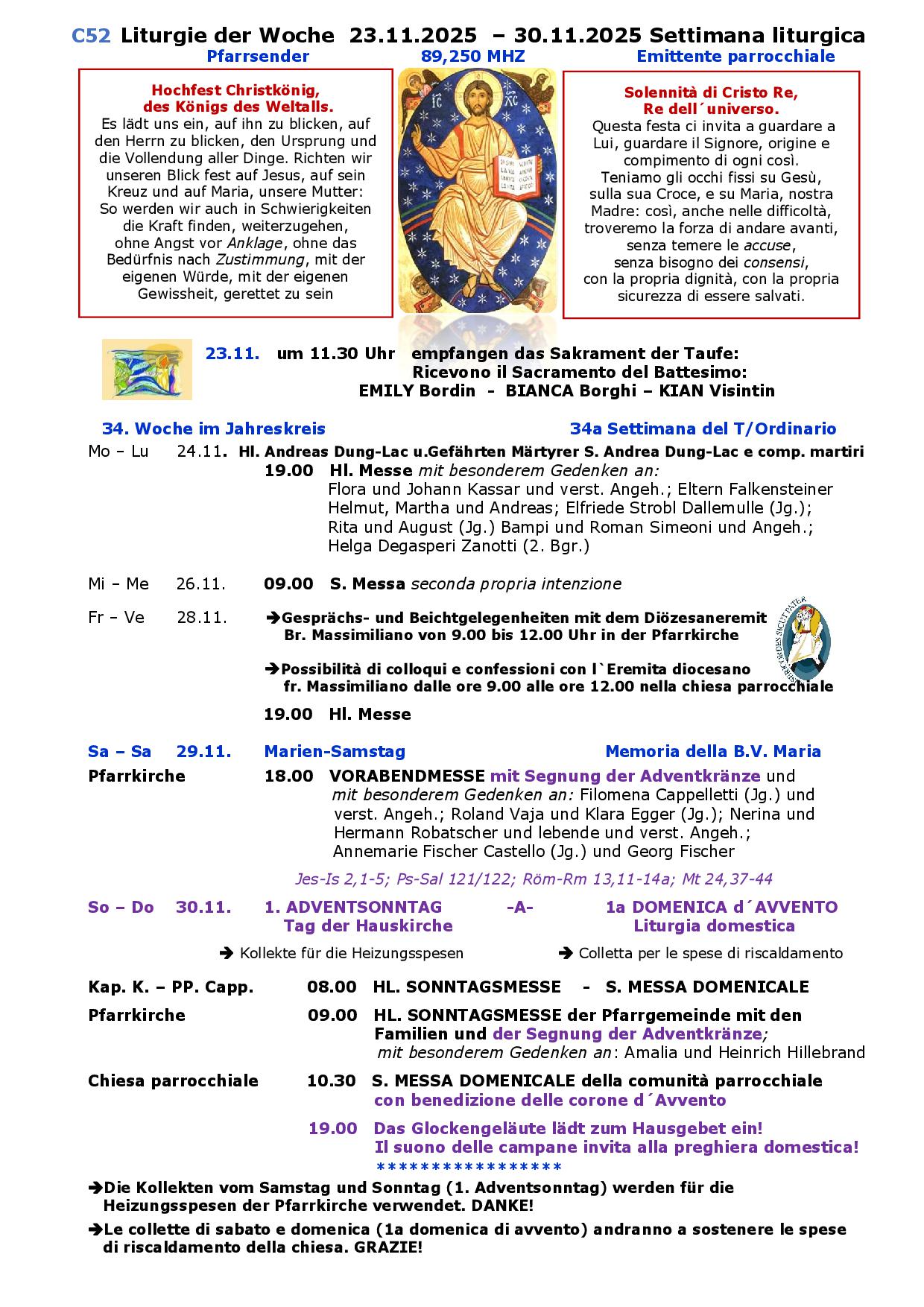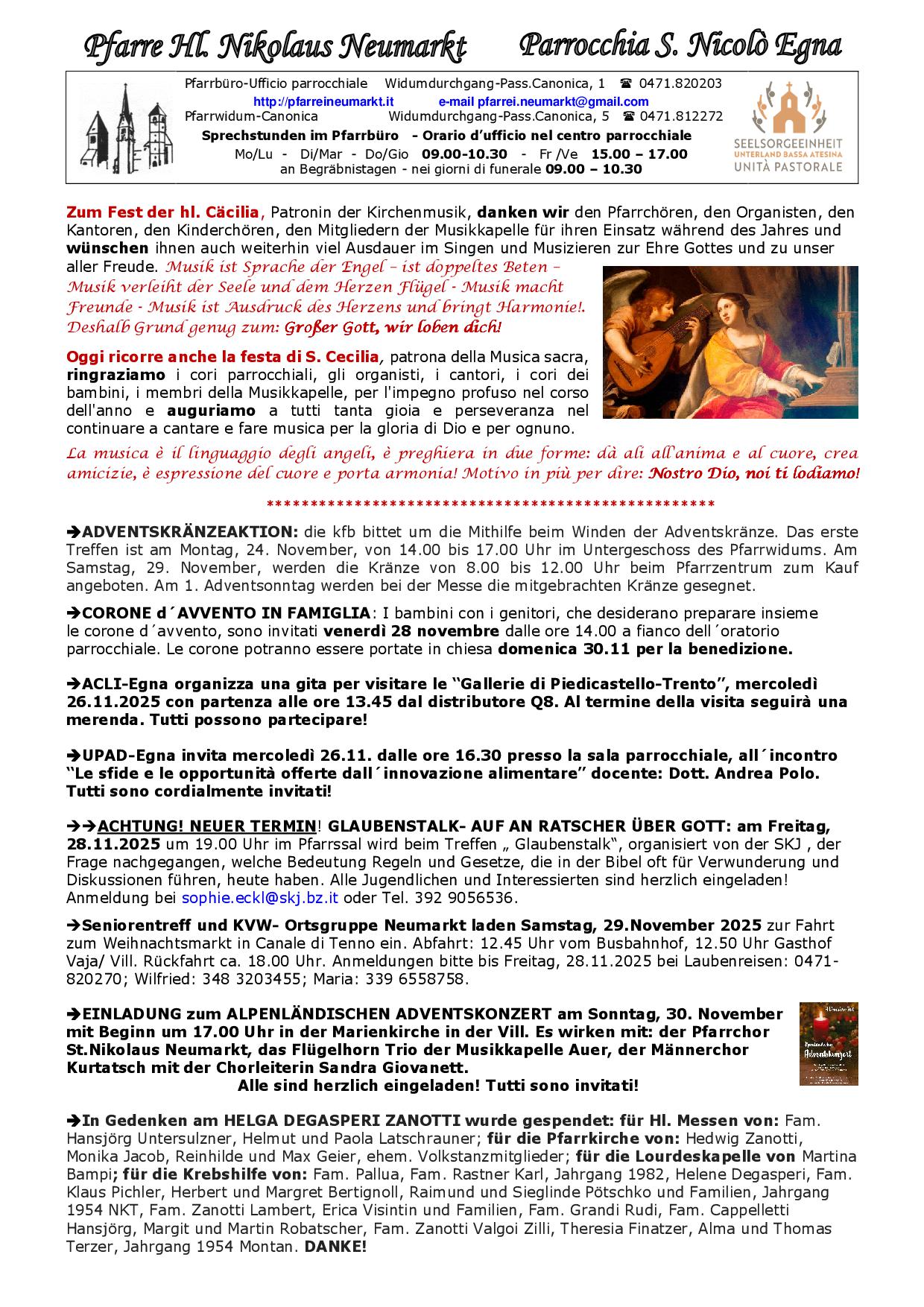 GLAUBENSTALK- AUF AN RATSCHER ÜBER GOTT: am Freitag, 28.11.2025 um 19.00 Uhr im Pfarrssal wird beim Treffen " Glaubenstalk", organisiert von der SKJ , der Frage nachgegangen, welche Bedeutung Regeln und Gesetze, die in der Bibel oft für Verwunderung und Diskussionen führen, heute haben. Alle Jugendlichen und Interessierten sind herzlich eingeladen! Anmeldung bei sophie.eckl@skj.bz.it oder Tel. 392 9056536.
